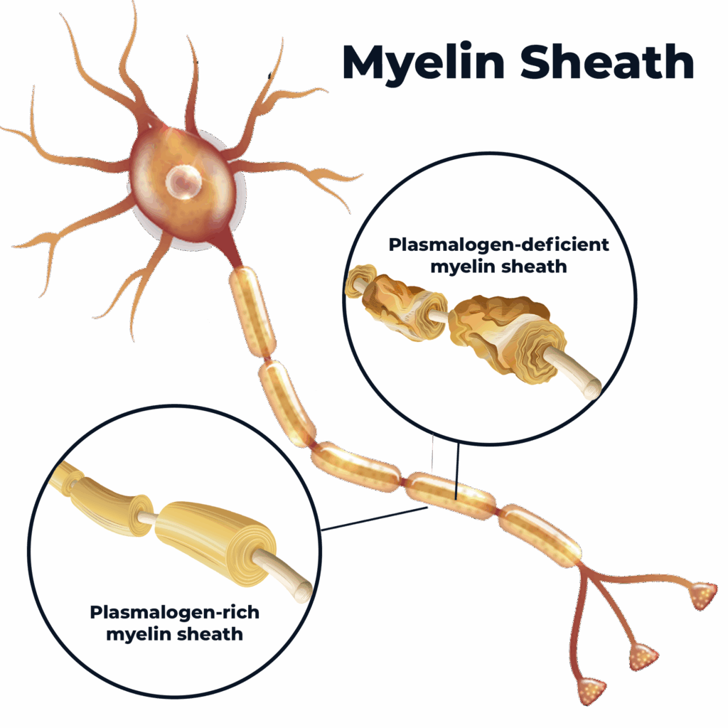 As we age, experience trauma such as concussions, or face neurological conditions like Parkinson’s, ALS, and MS—or developmental conditions such as autism, where white-matter/myelination challenges and inflammation can disrupt signal insulation and sensory processing—the myelin sheath can degrade, leading to cognitive and neurological decline. Because plasmalogens supply raw building materials for oligodendrocytes and act as powerful fat-soluble antioxidants that neutralize damaging peroxides from oxidative stress and inflammation, maintaining healthy levels of plasmalogens supports the integrity of the myelin sheath and promotes optimal brain function.